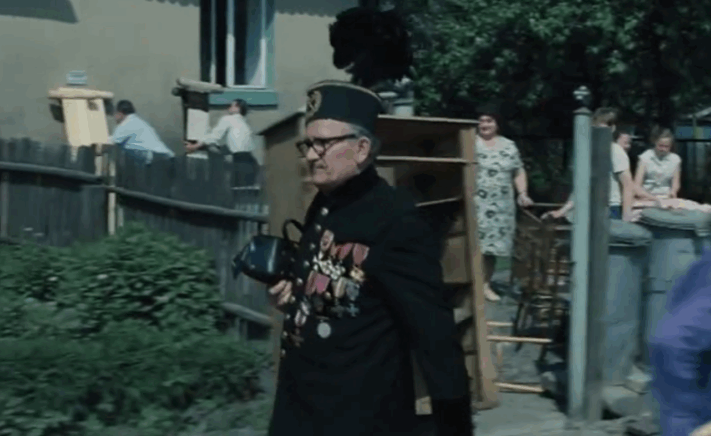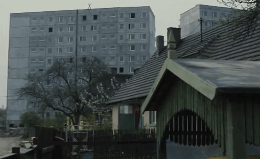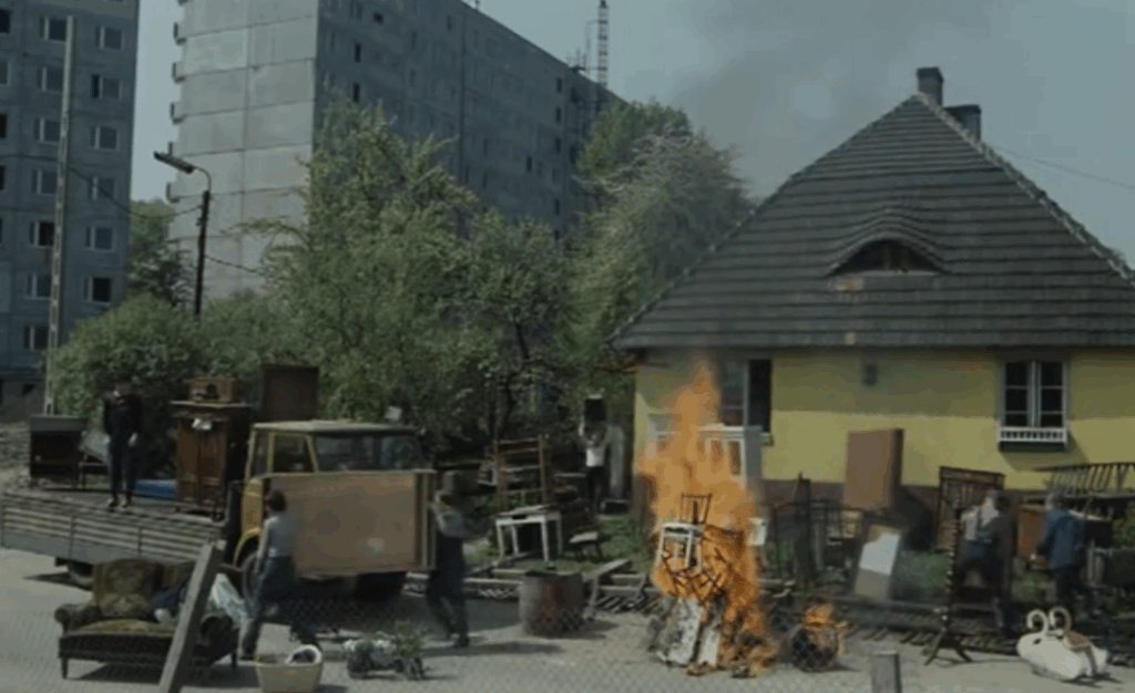 Karol wśród tego ogromnego zamieszania, znajduje chwile ukojenia w swoim ogrodzie-sadzie. Wśród scen możemy zobaczyć także wyprowadzkę sąsiednich rodzin do nowych bloków, z domu wynoszone są stare meble, które nie zmieszczą się w nowych mieszkaniach w blokach z wielkiej płyty – są one palone. Nowe wieżowce są określone przez bohaterów filmów jako „betonioki”. Od samego początku filmu, widzimy, że Karol jest przeciwny przeprowadzce do nowego mieszkania, która nie może ominąć również jego. Na swój sposób stara się z tym faktem walczyć – wylewa gnojówkę przed bramę swojego domu aby „odstraszyć” komisję urzędników, chowa się przed nimi w szopie i schowany przez szparę w deskach, obserwuje jak powyższa komisja, wręcza klucze i przydział jego małżonce ze słowami – „powiedźcie aby podpisał”.