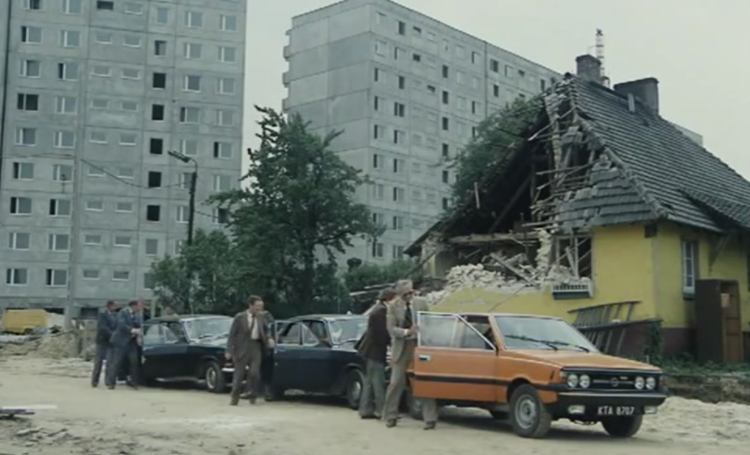 Karol wśród tego ogromnego zamieszania, znajduje chwile ukojenia w swoim ogrodzie-sadzie. Wśród scen możemy zobaczyć także wyprowadzkę sąsiednich rodzin do nowych bloków, z domu wynoszone są stare meble, które nie zmieszczą się w nowych mieszkaniach w blokach z wielkiej płyty – są one palone. Nowe wieżowce są określone przez bohaterów filmów jako „betonioki”. Od samego początku filmu, widzimy, że Karol jest przeciwny przeprowadzce do nowego mieszkania, która nie może ominąć również jego. Na swój sposób stara się z tym faktem walczyć – wylewa gnojówkę przed bramę swojego domu aby „odstraszyć” komisję urzędników, chowa się przed nimi w szopie i schowany przez szparę w deskach, obserwuje jak powyższa komisja, wręcza klucze i przydział jego małżonce ze słowami – „powiedźcie aby podpisał”.
