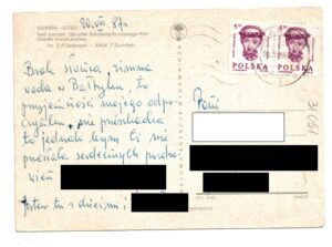 Pocztówka przedstawia osiedle mieszkaniowe Stogi z Gdańska i Ośrodek Szkolenia Kursowego PKP. Brak daty wydania pocztówki, widnieje data wysłania - 20 sierpnia 1987 r. Ciekawa jest treść listu z tyłu pocztówki - "brak słońca, zimna woda w Bałtyku" - klasyka polskiego lata nad morzem :).